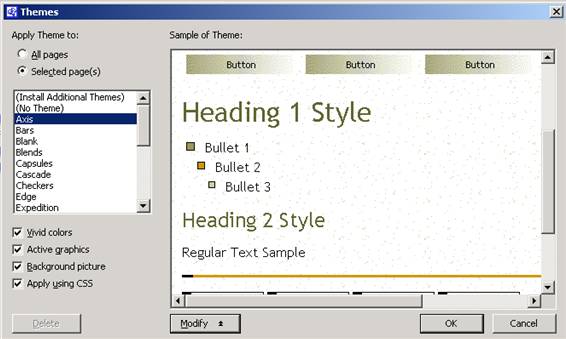 - culorile - schema de culori a unei teme specifica culoarea pentru textul normal, pentru anteturi, hyperlink-uri, textul din banner-ele paginii, pentru etichetele (textul) barelor de navigatie cat si pentru culoarea de fundal. Se pot folosi culori normale sau aprinse (vivid colors);