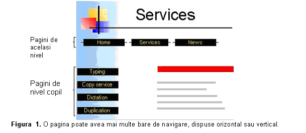 Atunci, folosind o navigare la acelasi nivel plus o hiperlegatura la pagina initiala, pagina model din figura 13 prezinta o bara de navigare (orizontala) care permite vizitatorilor site-ului sa navigheze la paginile principale din web. Pe latura din stanga paginii, folosind navigarea la nivel de pagini copil, bara de navigare verticala permite vizitatorilor sa navigheze la paginile copil ale paginii Services.