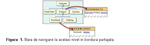 De exemplu, sa consideram ca aveti structura de web prezentata in figura 14. Pentru a permite vizitatorilor site-ului sa navigheze la paginile principale, voi adaugati o bara de navigare la acelasi nivel intr-o bordura partajata. Pe pagina Products, bara de navigare pare adecvata deoarece ea afiseaza hiperlegaturile la paginile principale. Totusi, cand vizualizati bara de navigare de pe pagina Downloads, bara de navigare afiseaza legaturile la paginile Downloads si Ordering, nu la paginile principale.