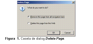 Pentru a sterge o pagina din structura de navigare, executati clic pe pagina respectiva si apoi apasati tasta Delete. Apare caseta de dialog Delete Page (vezi figura 18). Daca se doreste numai eliminarea paginii din barele de navigare, se selecteaza optiunea Remove this page from all navigation bars. Daca se doreste stergerea paginii din web, se selecteaza optiunea Delete this page from the Web.