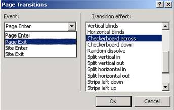 Efecte de animatie se pot seta si pentru tranzitia de la o pagina la alta (la intrare sau la iesirea dintr-o pagina, sau la intrarea / iesirea dintr-un site) utilizand optiunea Format Page Transition: