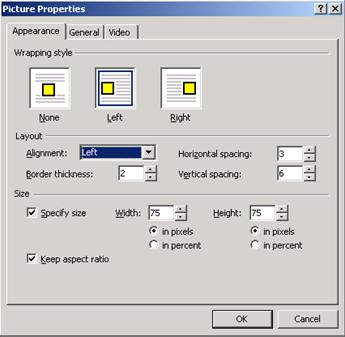 Pentru imaginile adaugate in pagina web se pot defini / modifica si proprietatile de afisare ale acestora, printre care: modalitatea de aliniere fata de text, aliniament, grosimea bordurii imaginii, spatierea orizontala si verticala fata de alte obiecte din pagina, marimea relativa (in procente) sau absoluta (in pixeli), un hyperlink si un text (balon) care va aparea la pozitionarea mouse-ului deasupra imaginii.