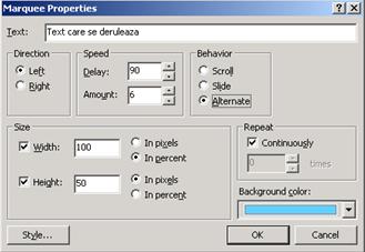 Un alt efect dinamic este si Marquee - un text care se deruleaza pe ecran, numai orizontal, pentru care se pot specifica mai multe optiuni printre care directia, viteza, comportamentul, marimea, numarul de repetari al derularii, culoarea de fundal a textului, etc.