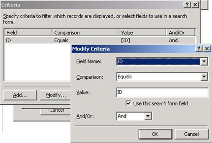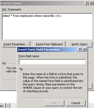 Optiunea Insert Parameter permite utilizarea unui camp din formular prin care se poate face filtrarea datelor in clauzele WHERE si HAVING ale comenzii SELECT. In urma executiei paginii si a trimiterii acesteia catre serverul de web, acesta va substitui valoare campului selectat in comanda SQL dupa care o va trimite spre executie in baza de date.