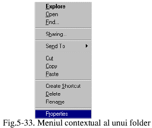 Proprietatile folderelor Pentru a vizualiza pe ecran proprietatile unui folder, pot fi utilizate trei metode: 1. Folderul este selectat in cadrul ferestrei Explorer (un click cu butonul stang al mouse-ului), dupa