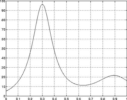 y = 1./((x-.3).^2 + .01) + 1./((x-.9).^2 + .04) - 6;