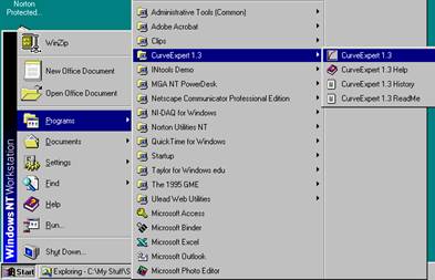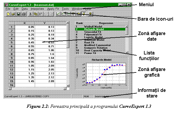 Dupa lansarea sistemului de operare (Microsoft Windows 95 sau NT) al calculatorului (vezi Anexa 4), introducerea codului utilizatorului si a parolei corespunzatoare, lansarea in executie a programului CurveExpert se realizeaza prin selectarea optiunii CurveExpert 1.3 din cadrul submeniului CurveExpert 1.3 al sectiunii Programs din meniul de start al sistemului de operare (figura 2.1). Fereastra principala a programului CurveExpert este partitionata in sase zone, |