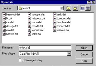 Numai rareori coordonatele punctelor experimentale sunt introduse manual de catre utilizator in zona de afisare a datelor. In situatia in care valorile experimentale exista intr-un fisier de date, acesta poate fi citit de catre programul CurveExpert prin apelarea comenzii Open din submeniul File al meniului ferestrei principale a programului sau prin apasarea butonului corespunzator din bara de icon-uri. Actiunile de mai sus conduc la deschiderea unei ferestre pentru selectarea fisierului cu date, formatul si comenzile acesteia fiind specifice mediului de operare Windows (figura 2.3). Fisierul trebuie sa contina caractere ASCII si sa utilizeze caracterul Tab pentru separarea a doua valori de pe aceeasi linie.