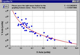 Programul afiseaza graficul functiei de regresie de tipul selectat care aproximeaza optim setul de puncte experimentale (figura 2.5) iar utilizatorul are la dispozitie (prin apasarea butonului Info) o serie de optiuni (figura 2.6) privind: