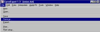In situatiile in care valorile coordonatelor punctelor experimentale au fost introduse manual sau au fost citite dintr-un fisier de date si apoi au fost modificate, utilizatorul poate opta pentru salvarea noilor valori intr-un fisier de date nou sau in unul deja existent, prin alegerea comenzilor Save sau Save as . din submeniul File al meniului ferestrei principale a programului (figura 2.7). |