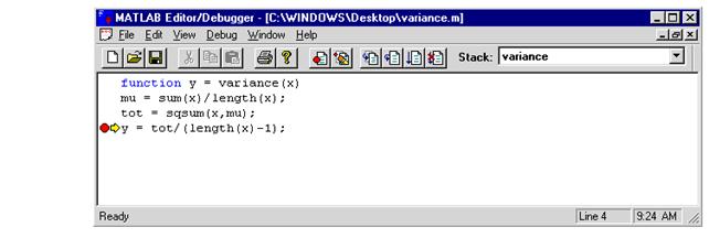 Daca fisierul .m (adica variance.m) a fost creat cu editorul MATLAB si suntem in fereastra Editor/Debugger, se continua din acest punct.