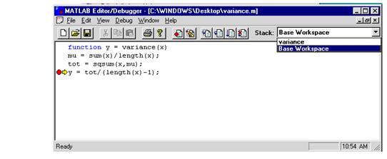 Se sterge breakpoint-ul din linia 4 din variance.m prin plasarea cursorului pe linie si selectarea optiunii Clear Breakpoint din meniul Debug. Se continua executia programului cu Continue din meniul Debug.
