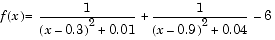 f=inline(`1./((x-.3).^2+.01)+1./((x-.9).^2+.04)-6');