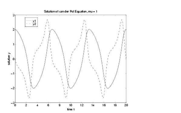 Pentru exemplul van der Pol, se poate apela la ode45. Daca intervalul de timp este [0 20] iar conditiile initiale y(1)=2 si y(2)=0 vom avea