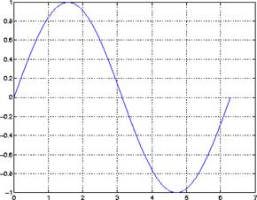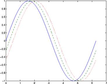 t = 0:pi/100:2*pi;y = sin(t);y2 = sin(t-0.25); y3 = sin(t-0.5);plot(t,y,'-',t,y2,'--',t,y3,':')