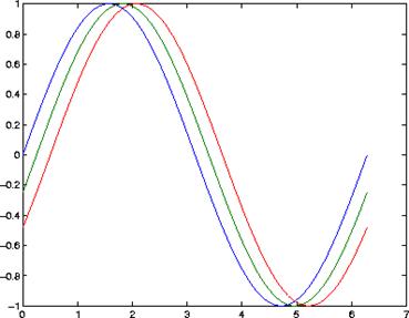 y2 = sin(t-0.25); y3 = sin(t-0.5);plot(t,y,t,y2,t,y3)