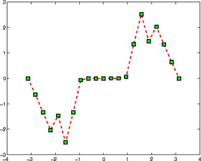 x = -pi:pi/10:pi;y = tan(sin(x)) - sin(tan(x));plot(x,y,'--rs','LineWidth',2,'MarkerEdgeColor','k',