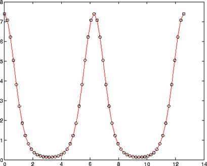 x = 0:pi/15:4*pi;y = exp(2*cos(x));plot(x,y,'-r',x,y,'ok')