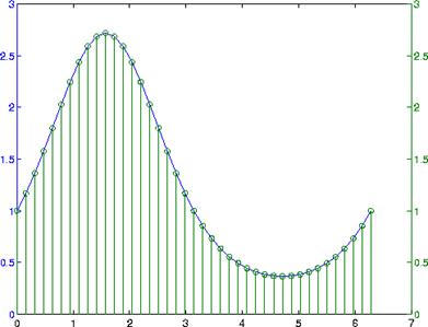 t = 0:pi/20:2*pi;y = exp(sin(t));plotyy(t,y,t,y,'plot','stem')