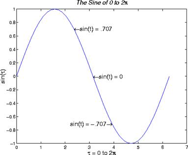 'leftarrowsin(t) = .707', 'FontSize',16)text(pi,sin(pi),'leftarrowsin(t) = 0', 'FontSize',16)text(5*pi/4,sin(5*pi/4),'sin(t)=-.707rightarrow', 'HorizontalAlignment','right', 'FontSize',16)