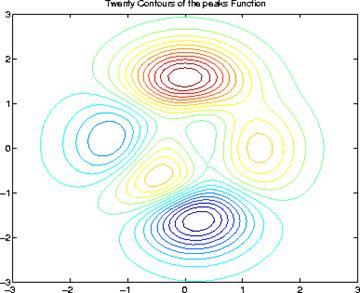 [X,Y,Z] = peaks;contour(X,Y,Z,20)