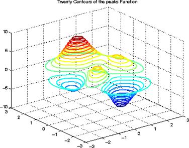 afiseaza 20 de contururi ale functiei peaks intr-o vedere