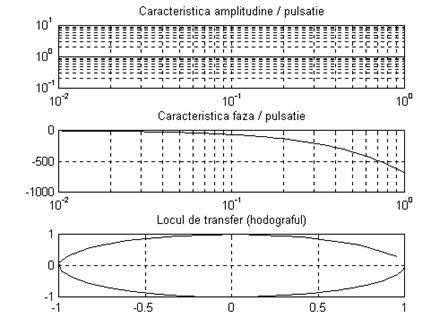 Raspunsul in frecventa poate fi reprezentat in doua moduri: sub forma de diagrama Bode (caracteristici logaritmice de frecventa figura 2a)) sau diagrama Nyquist (locul de transfer sau hodograful, figura 2b)). Ambele metode permit obtinerea aceleiasi informatii, diferenta consta in modul in care este prezentata aceasta informatie. Pentru a trasa caracteristicile de frecventa in reprezentare logaritmica (Bode) se creeaza un vector de frecvente cu ajutorul functiei Matlab logspace si se calculeaza valorile functiei de transfer |Hd(jw)| la aceste frecvente prin apelul functiei Bode (conform ecuatiei (6)). Se reprezinta |Hd(jw)|dB in functie de frecventa.