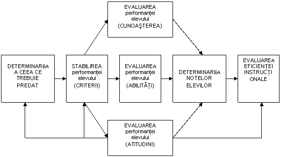 v evaluatorii educationali trebuie sa vizeze in mod separat accentul pe comportamentul enuntat in obiectivul educational si nivelurile de performanta asteptate din partea elevilor (op. cit., p 193 - 194).