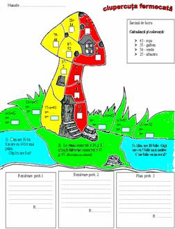 1: Rezolva corect cele noua operatii de adunare / scadere. 2: Afla cele sase numere necunoscute folosind modelul ecuatiilor simple. 3: Transpune corect in exercitiu suma si diferenta si aduna rezultatele obtinute. 4: Scrie rezolvarea problemei corect specificand ce a aflat. Afla cate bile aveau cei doi copii si specifica ce a aflat. Coloreaza corect si frumos intreaga ciupercuta. |