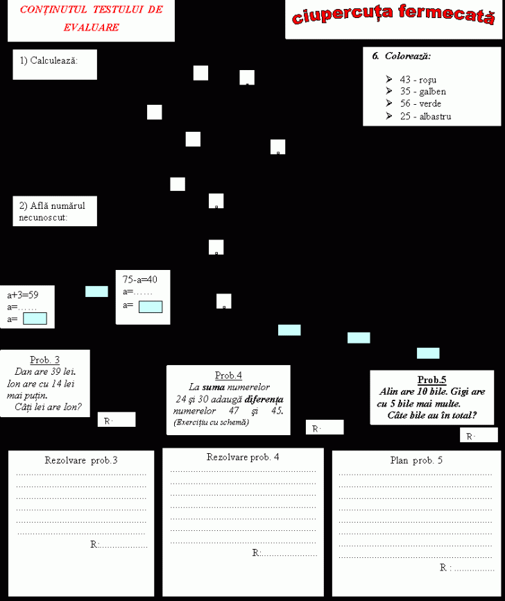 1: Rezolva corect sase-sapte operatii de adunare / scadere. 2: Afla patru numere necunoscute folosind modelul ecuatiilor simple. 3: Transpune corect in exercitiu suma si diferenta. 4: Scrie rezolvarea problemei printr-o operatie si afla raspunsul corect. Afla corect cate bile a avut Gigi si specifica ce a aflat. 6: Coloreaza corect majoritatea "casutelor". |