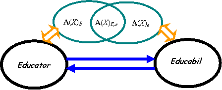 - b) Cu cat pozitia axiologic-valorizatoare comuna, A(X)E,e, a educatorului si educabilului fata de ideatica mesajului X este mai extinsa, cu atat acordul axiologic este mai extins. Cazul ideal si anume cel al comunicarii in acordul axiologic complet este cel al identitatii intre pozitile axiologice ale educatorului si educabilului fata de ideatica mesajului X - A(X)E º A(X)e º A(X)E,e