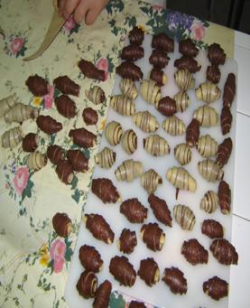 Rahatul trebuie pudrat cu faina sau zahar farin ca sa nu se mai lipeasca.As propune in loc sa umplem cornuletele cu rahat ,sa le umplem cu nuca macinata,albus de ou si zhar ca la cozonac iar pe deasupra sa le undem cu miere de albine si ca decor sa punem pe suprafata maro ciocolata razuita alba,iau ce suprafata galben-aurie ciocolata razuita neagra.