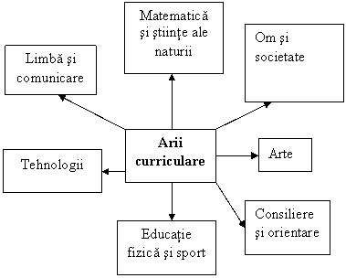 I. Arii curriculare reprezinta domenii care ofera o viziune multi- si interdisciplinara asupra obiectelor de studiu: Limba si comunicare, Matematica si stiintele naturii, Om si societate, Arte, Tehnologii, Educatie fizica si sport, Consiliere si orientare;
