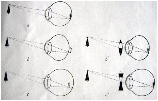 Razele luminoase care vin de la o sursa luminoasa sau luminata (raze reflectate pe suprafata unui obiect) strabat prin mediile transparente (cornee, umoare apoasa, cristalin, umoare sticloasa) si ajung pe retina. Mediile transparente constituie un sistem dioptric, in care razele se refracta (mediu refringent) si se concentreaza (mediu convergent) intr-un focar pe retina, determinandformarea unei imagini reale, mai mica si rasturnata. Razele de lumina sufera o tripla refractie :