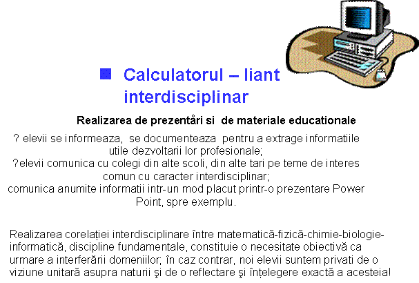 Realizarea corelatiei interdisciplinare intre matematica-fizica-chimie-biologie-informatica, discipline fundamentale, constituie o necesitate obiectiva ca urmare a interferarii domeniilor; in caz contrar, privam elevul de o viziune unitara asupra naturii si de o reflectare si intelegere exacta a acesteia.