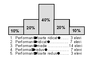 2. O tehnica specifica de control al erorilor tendintei centrale si restrangerii de rang este tehnica evaluarii cu distribuire fortata. Aceasta consta in a recomanda evaluatorilor sa incadreze frecventa notelor sau calificativelor acordate in proportiile distributiei normale (gaussiene). In acest scop, se folosesc scale cu proportii normalizate care precizeaza ce procente din totalul subiectilor evaluati corespund fiecarui nivel al scalei in conditiile in care esantionul evaluat are o distributie normala a subiectilor in functie de caracteristica evaluata. Pentru o clasa cu un efectiv de 34 de elevi, o scala cu distribuire fortata se prezinta ca in figura nr.4. Pentru efective mai mari (peste 100) se pot folosi scale cu 7 sau 9 trepte, adaptandu-se in acest sens proportiile distributiei normale.