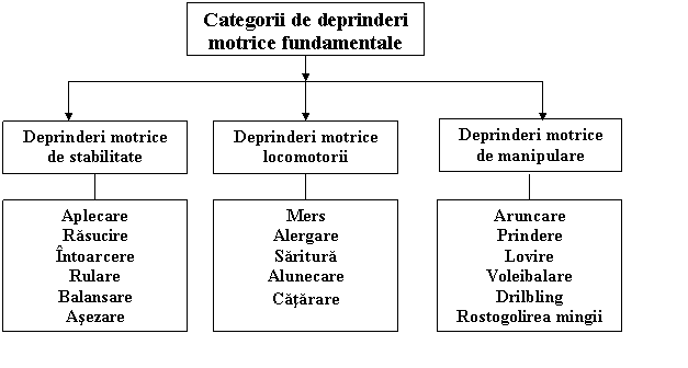 j) Evidentiind ca principala contributie a educatiei fizice si sportului la dezvoltarea personalitatii, formarea deprinderilor de miscare, D.Gallahue (1993) considera ca acestea pot fi clasificate in trei categorii, si anume: deprinderi de stabilitate, deprinderi locomotorii si deprinderi de manipulare. (schema nr.6.1.)