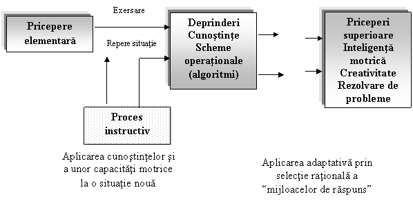 În domeniul activitatilor corporale, unde tipica, dar nu exclusiva, este invatarea motrica, procesul de instruire vizeaza formarea deprinderilor si priceperilor motrice. Deprinderile motrice reprezinta "rezultatul invatarii, fiind o maniera de comportare care se formeaza prin exersare [.]", cea mai importanta caracteristica a lor fiind "sinteza realizata pe plan cognitiv, senzori-motric sau chinestezic." (M.Epuran, 1976)