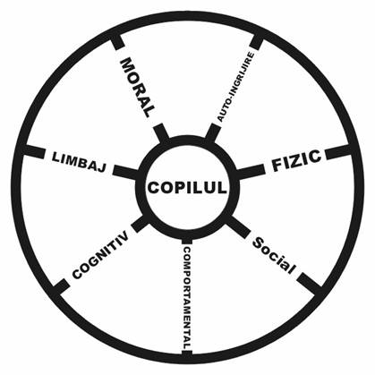 In aceasta imagine copilul se afla in centru si fiecare domeniu de dezvoltare este ca o spita a rotii.