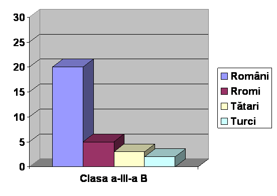 Observam ca in aceasta clasa predomina elevii de nationalitatea romana (20), urmati de cei rromi (5), tatari (3) si turci (2) .