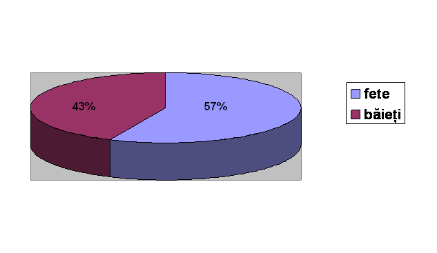 Putem observa ca procentajul cel mai mare il detin fetele, de 57% (17) fiind urmate de procentajul baietilor de 43% (13).