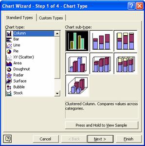 Va apare o fereastra de dialog din care se selecteaza tipul graficului. Fiecare tip are mai multe sub tipuri din care il putem alege pe cel care corespunde cel mai bine dorintelor noastre. Acesta este primul pas (din 4) pentru crearea unui grafic. Pentru a trece la pasul urmator se apasa butonul Next.