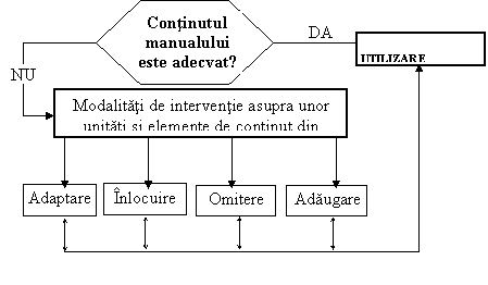 In conditiile noului curriculum, lectura programei si a manualelor nu mai este in mod obligatoriu liniara. Programa trebuie parcursa in mod necesar de catre toti, dar ea, ca si manualele se pliaza unei citiri personale si adaptate. Asupra continuturilor programei profesorul poate interveni prin regruparea lor sub temele unitatilor de invatare pe care le-a stabilit. Asupra unor unitati sau elemente de continut din manual profesorul poate interveni in diferite moduri - adaptare, inlocuire, omitere, adaugare - sau poate utiliza alte materiale-suport, conform algoritmului sugerat prin schema urmatoare: