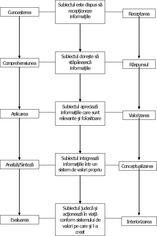 B) Taxonomia domeniului afectiv din schema prezentata apartine lui Krathwohl si adopta un alt criteriu de clasificare: cel al interiorizarii. Cele cinci clase de obiective descriu un continuu afectiv, marcand etape posibile in asimilarea si practicarea unei valori, unei norme etc. In primul stadiu, elevul constientizeaza prezenta unor valori, norme, reguli, exigente, fenomene, activitati dezirabile etc. si le acorda atentie (receptare), in al doilea "reactioneaza" adecvat, in mod voluntar "le cauta", simte satisfactie in contact cu ele. In stadiul al treilea, le "valorizeaza", le pretuieste, le conceptualizeaza, le sedimenteaza si le "organizeaza", pentru ca in ultimul stadiu, sistemul de valori constituit sa "caracterizeze" si sa exprime personalitatea elevului.