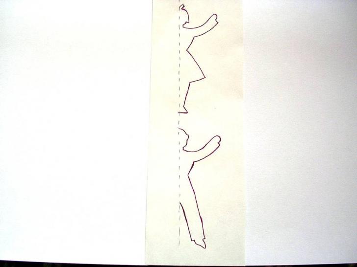 Pe coala de xerox se traseaza dreptungiuri cu lungimea de 10 cm si latimea de 7 cm. Se decupeaza. Fiecare dreptunghi se indoiae pe lungime in doua, apoi se aseaza sablonul cu jumatatea dreapta pe partea indoita, se traseaza conturul si apoi se decupeaza. Se repeta pana se obtin trei fetite si trei baieti.