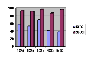 La cea de-a cincea cerinta doar 38% din elevii claselor a IX-a si a X-a au ales varianta de raspuns "b) veche" in timp ce la clasele a XI-a si a XII-a aceasta varianta a fost incercuita de 96% din elevi.