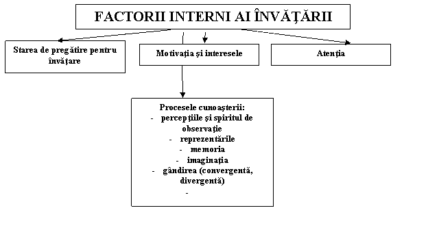 - dorinta de a invata, care trebuie stimulata. Termenii motivatie, intentie, interes, aspiratie, ambitie, autodeterminare sunt cel mai des intalniti in legatura cu procesul invatarii, organizat de profesor, dar realizat de elev. Poate ca notiunea de autoinvatare s-ar potrivi cel mai bine efortului individual facut de subiect pentru insusirea continutului instruirii;