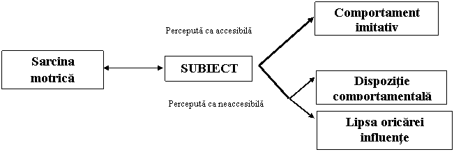 Precizarea tipurilor de interactiuni este importanta prin faptul ca evidentiaza o noua variabila care influenteaza executia motrica, si anume perceptia sarcinii motrice. În functie de dificultate acesteia si de perceptia subiectului asupra ei (dificultatea perceputa), subiectul care asista la executia ei de catre un model, poate incerca reproducerea actiunii motrice sau nu (schema nr.8.1.).