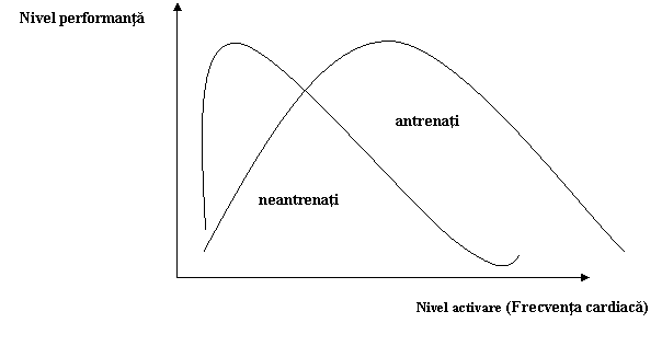 Cercetarile din domeniul invatarii motrice au scos in evidenta ca exista un raport de U - inversat intre gradul de activare si cel al performantei obtinute de subiect. Relatia este descrisa de legea lui Yarkes - Dodson. Conform acestei legi pentru fiecare peformanta exista un nivel optim de activare care nu trebuie depasit. De asemenea, s-a dovedit ca exista diferente intre nivelul de activare optim la incepatori, avansati si la sportivii de inalta performanta. (graficul nr.8.1.)