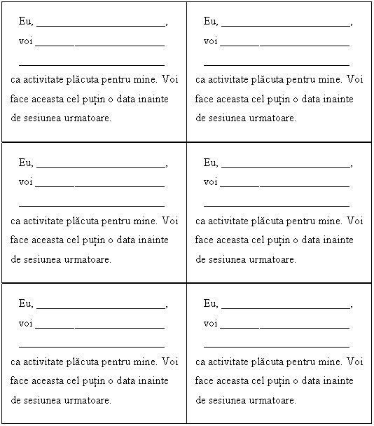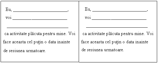 De exemplu, Eu, Maria, voi (merge la plimbare, voi citi o carte) ca activitate placuta pentru mine. Voi face aceasta cel putin o data inainte de sesiunea urmatoare.